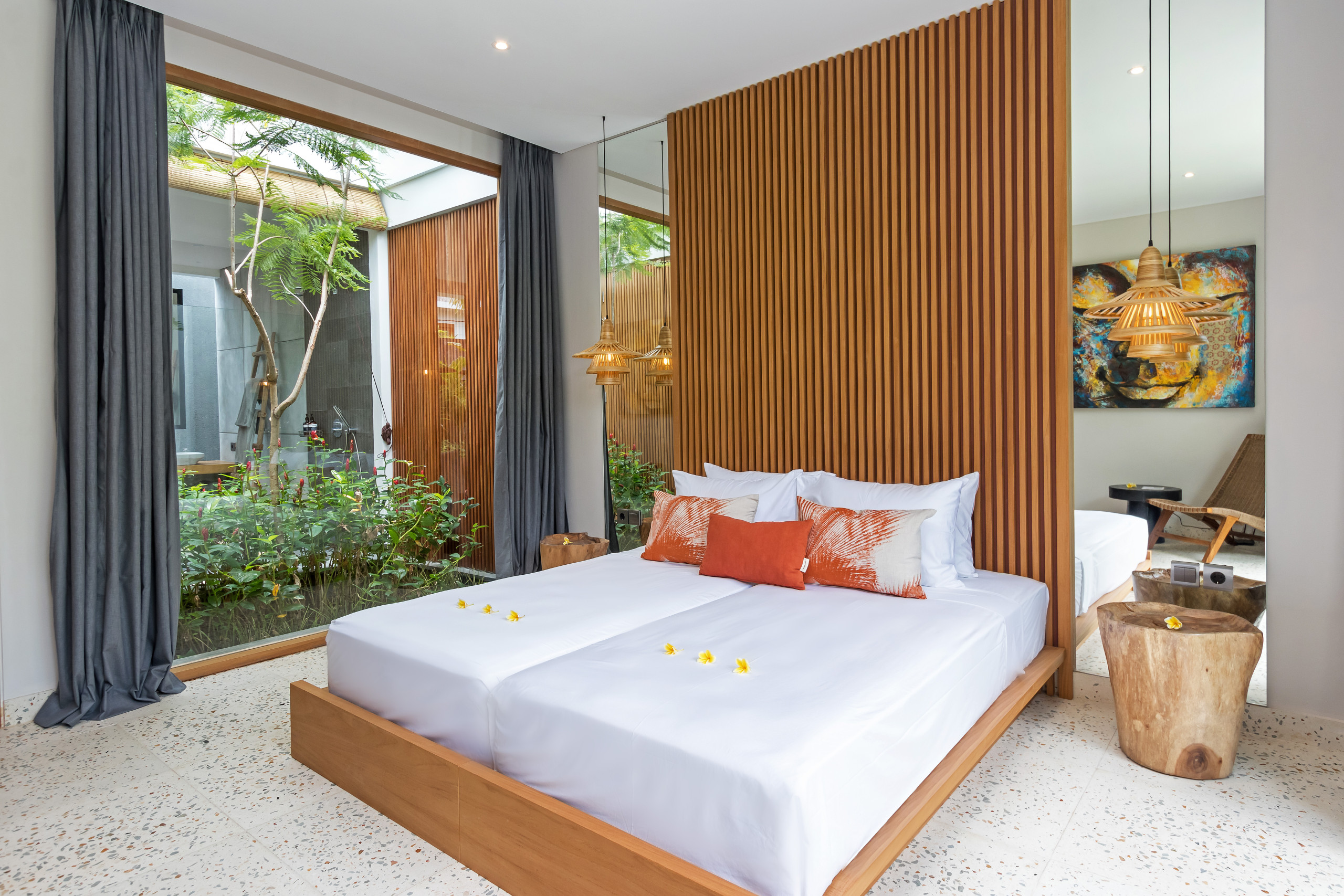 Los cuatro dormitorios de Little Manao están elegantemente diseñados, fusionando de manera armoniosa la estética moderna con los elementos de diseño tradicional balinés. La suite principal ofrece vistas panorámicas de la piscina y cuenta con una cama king-size con lujosos doseles. El baño en suite incluye una alcoba de ducha y una bañera hundida. Adjunto al dormitorio principal hay una habitación interconectada, perfecta para familias que viajan con bebés. Esta habitación versátil puede usarse como habitación infantil con dos camas individuales o como habitación de adultos combinando las dos camas individuales en una cama king-size.