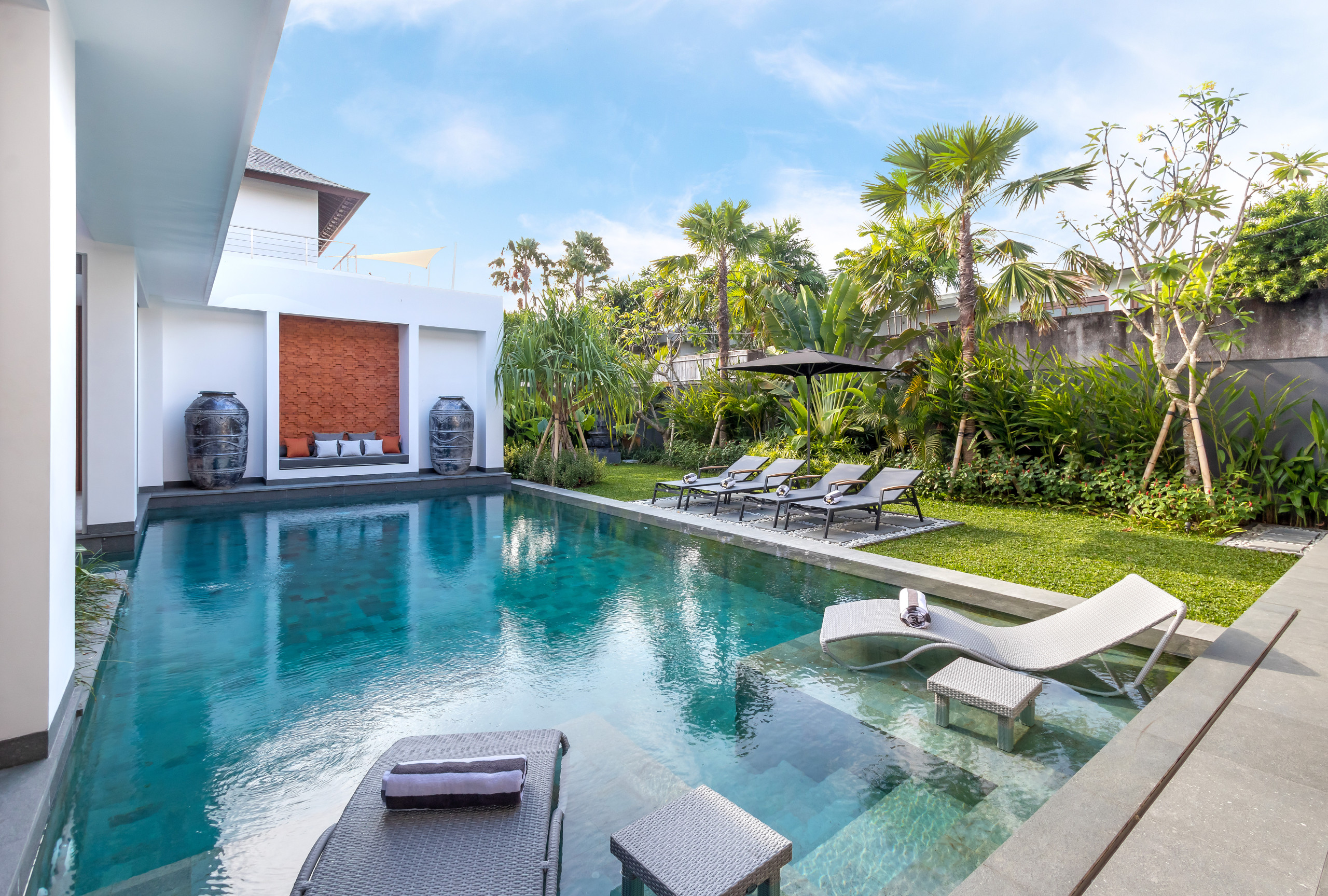 La gran piscina de quince metros es perfecta para un largo y relajante, mientras que el jardín, decorado con exuberantes flores tropicales y hermosas palmeras balinesas, es perfecto para un largo paseo a la luz de la luna o una noche de fiesta o barbacoa con amigos y familiares.