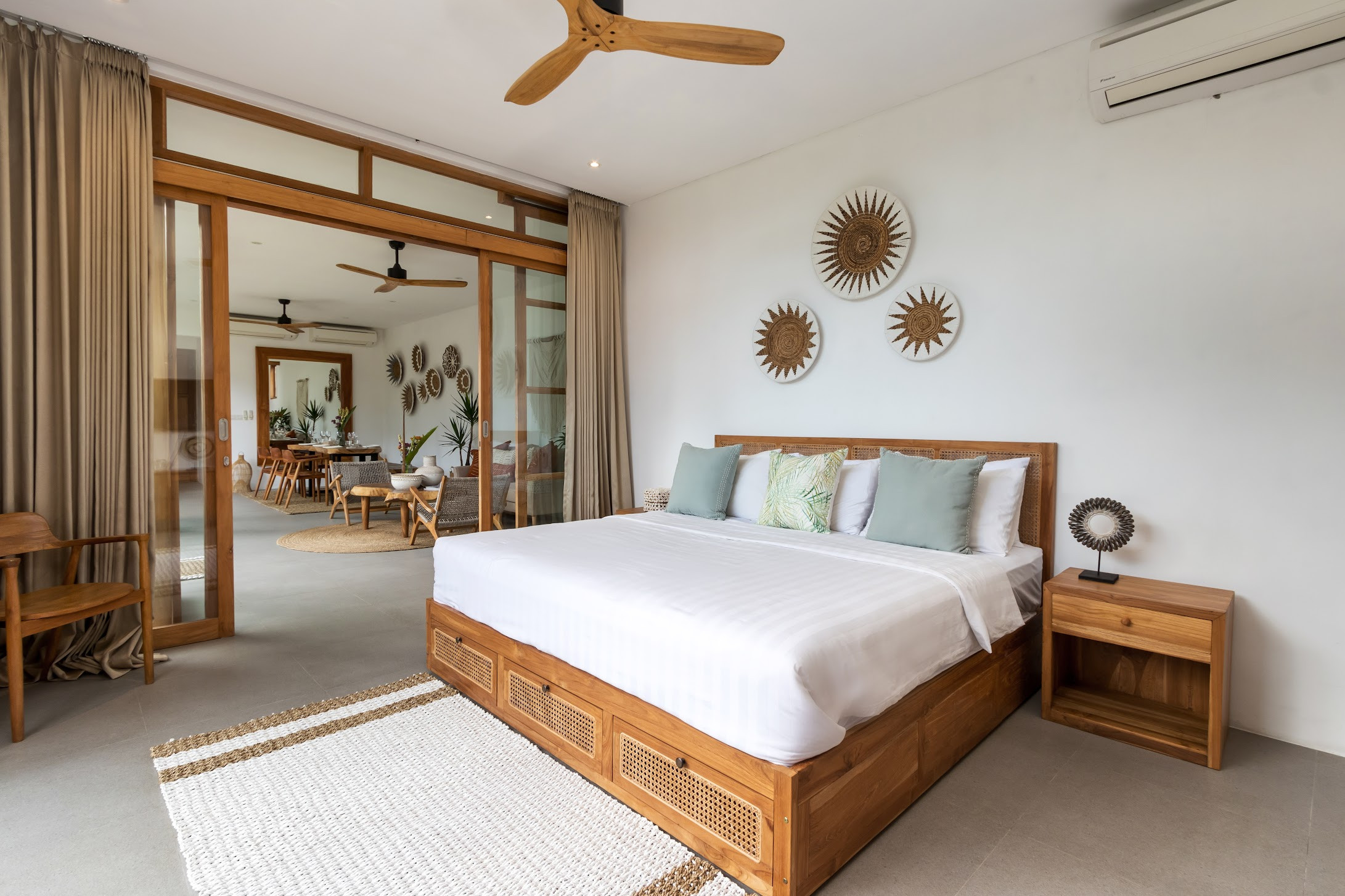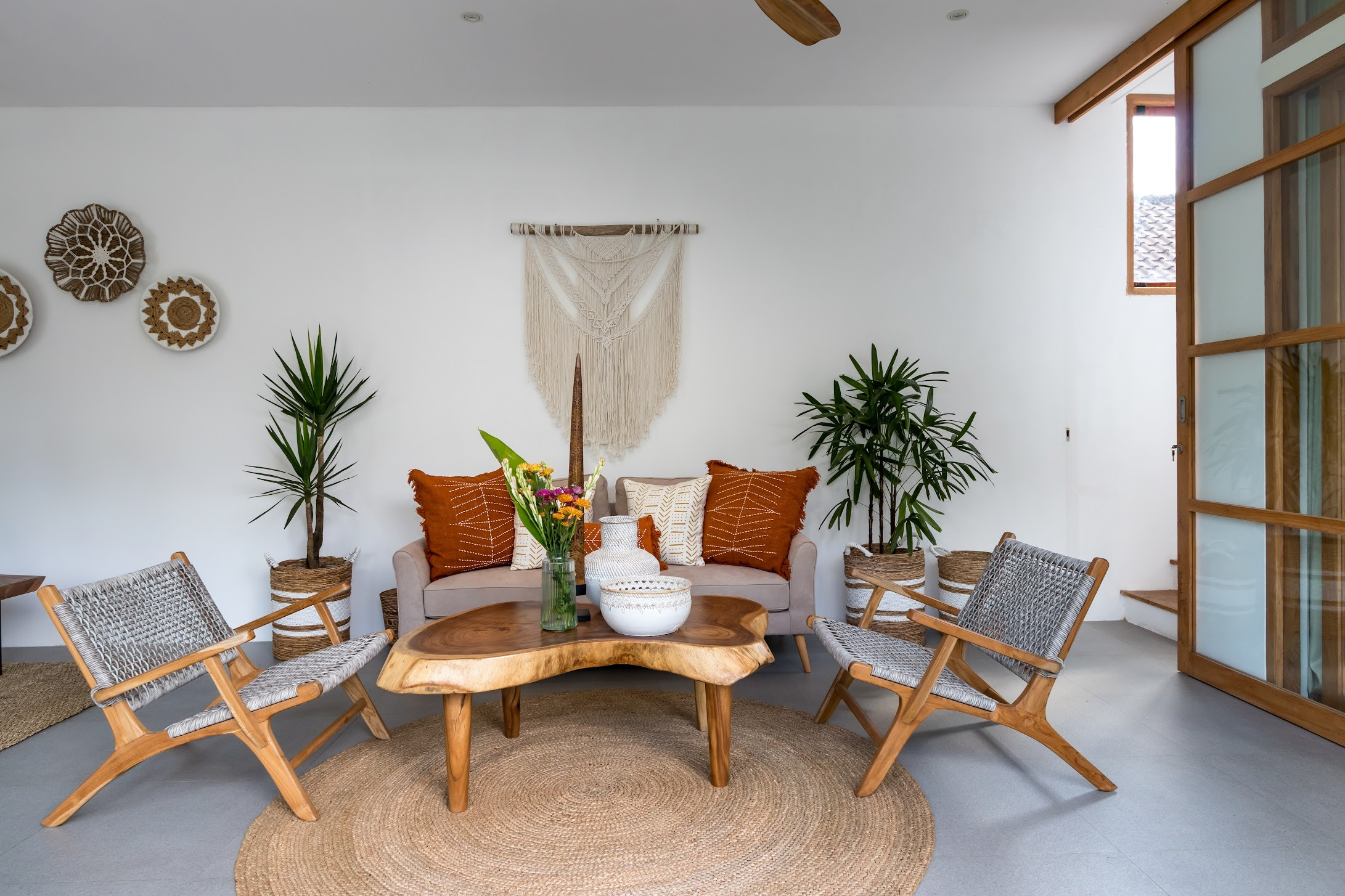 Las estancias de la villa son amplias y están decoradas en un estilo boho, con un salón, zona de comedor, cocina completa y sala de medios. Las puertas del patio se abren al jardín, lo que le permite disfrutar de la brisa tropical mientras se relaja en el sofá.