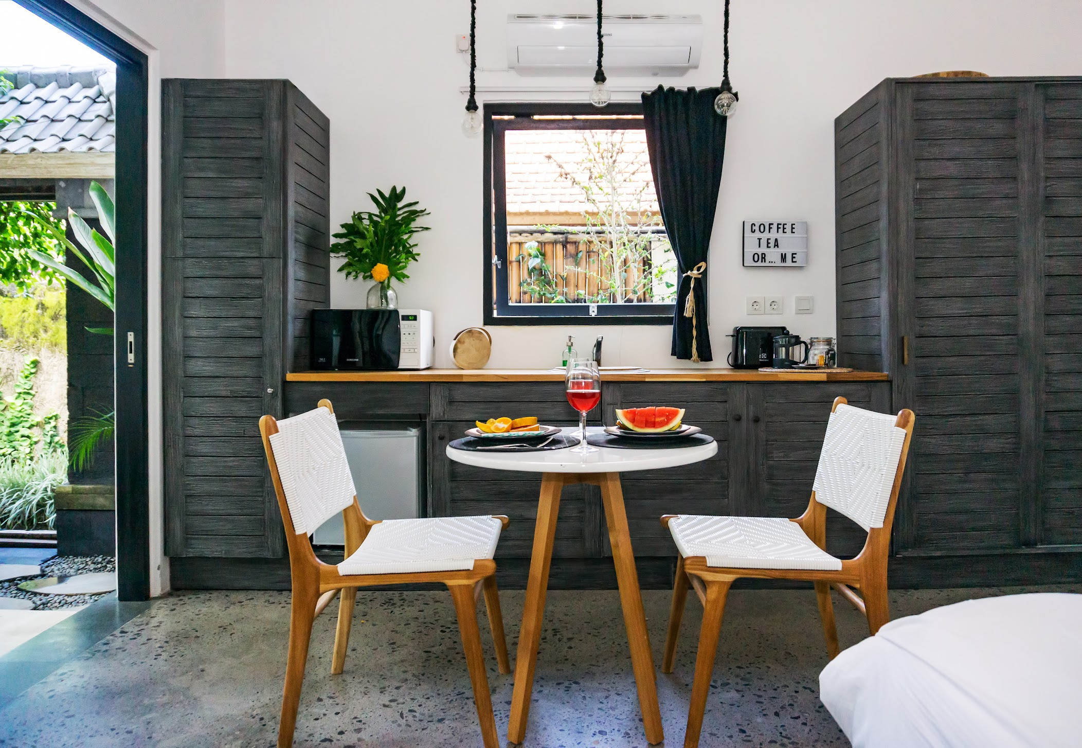 La sala de estar y el dormitorio de Villa Lora están perfectamente integrados, creando un espacio de vida contemporáneo de estilo loft. Las grandes puertas correderas de vidrio proporcionan abundante luz natural y acceso directo al jardín y la piscina. El salón también cuenta con una pequeña cocina con una mesa de comedor para dos personas, perfecta para disfrutar de comidas o una experiencia de comedor acogedora. El espacio está decorado con pinturas murales y artefactos tradicionales, lo que añade a su encanto. La cocina está equipada con fregadero, tostadora, microondas y cubiertos, así como con instalaciones para hacer café y té.