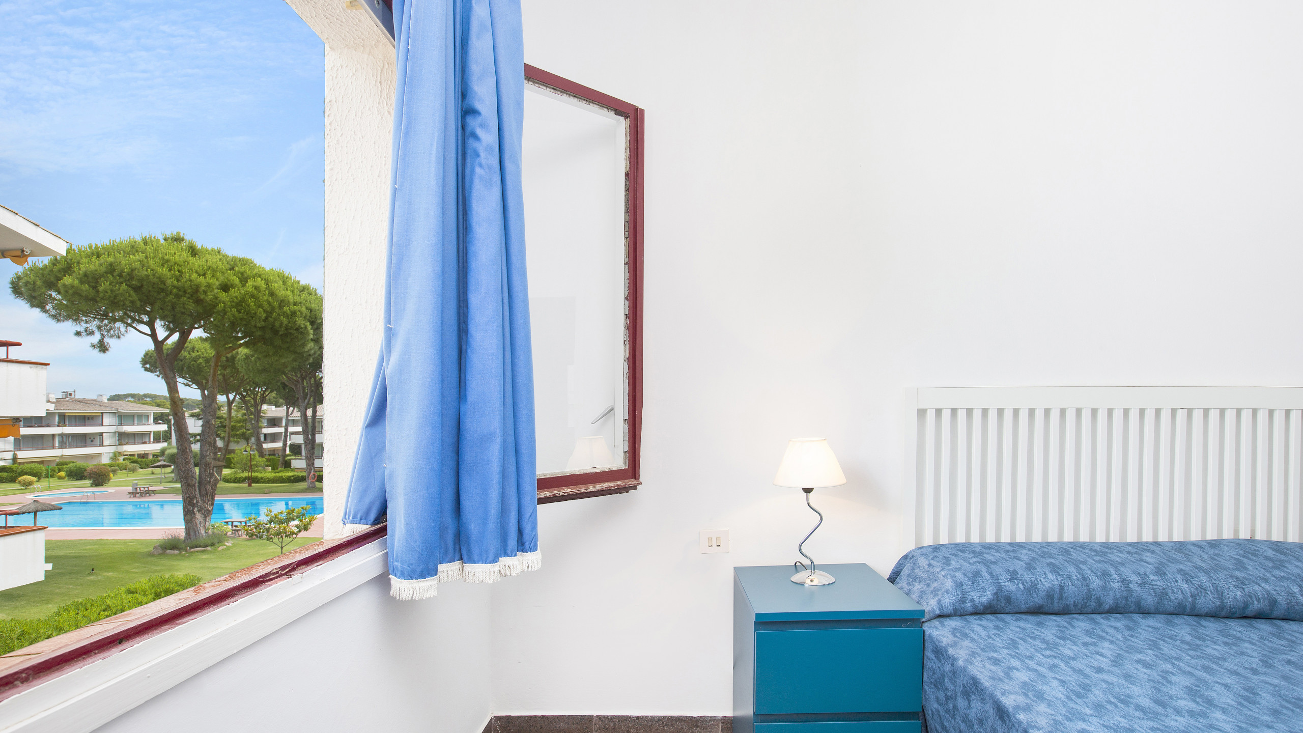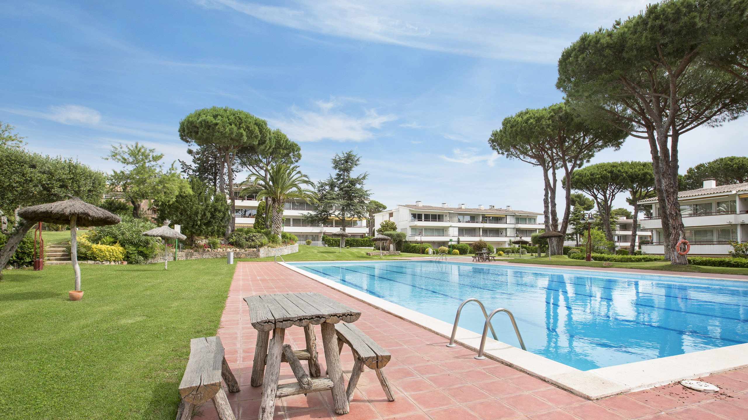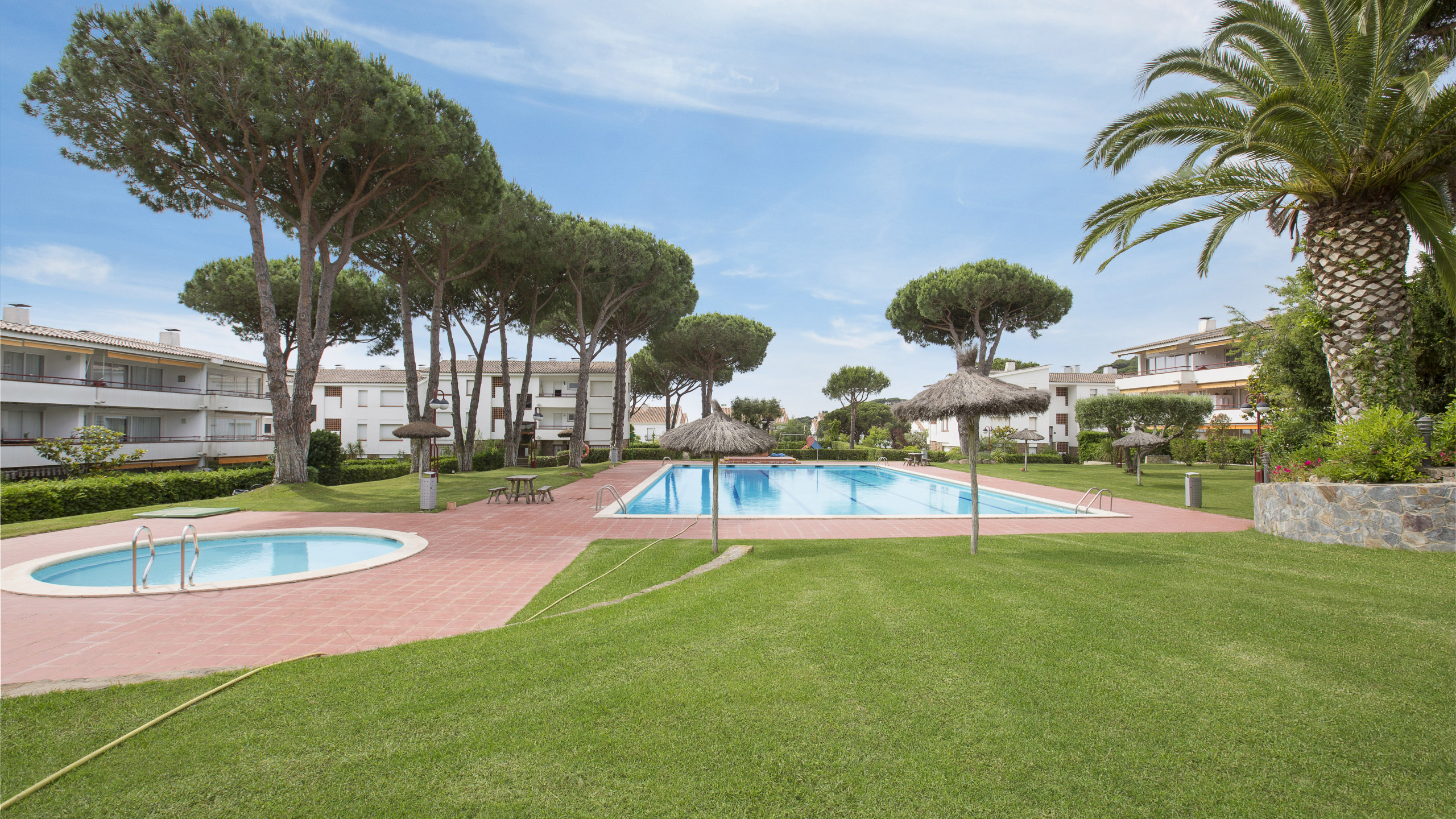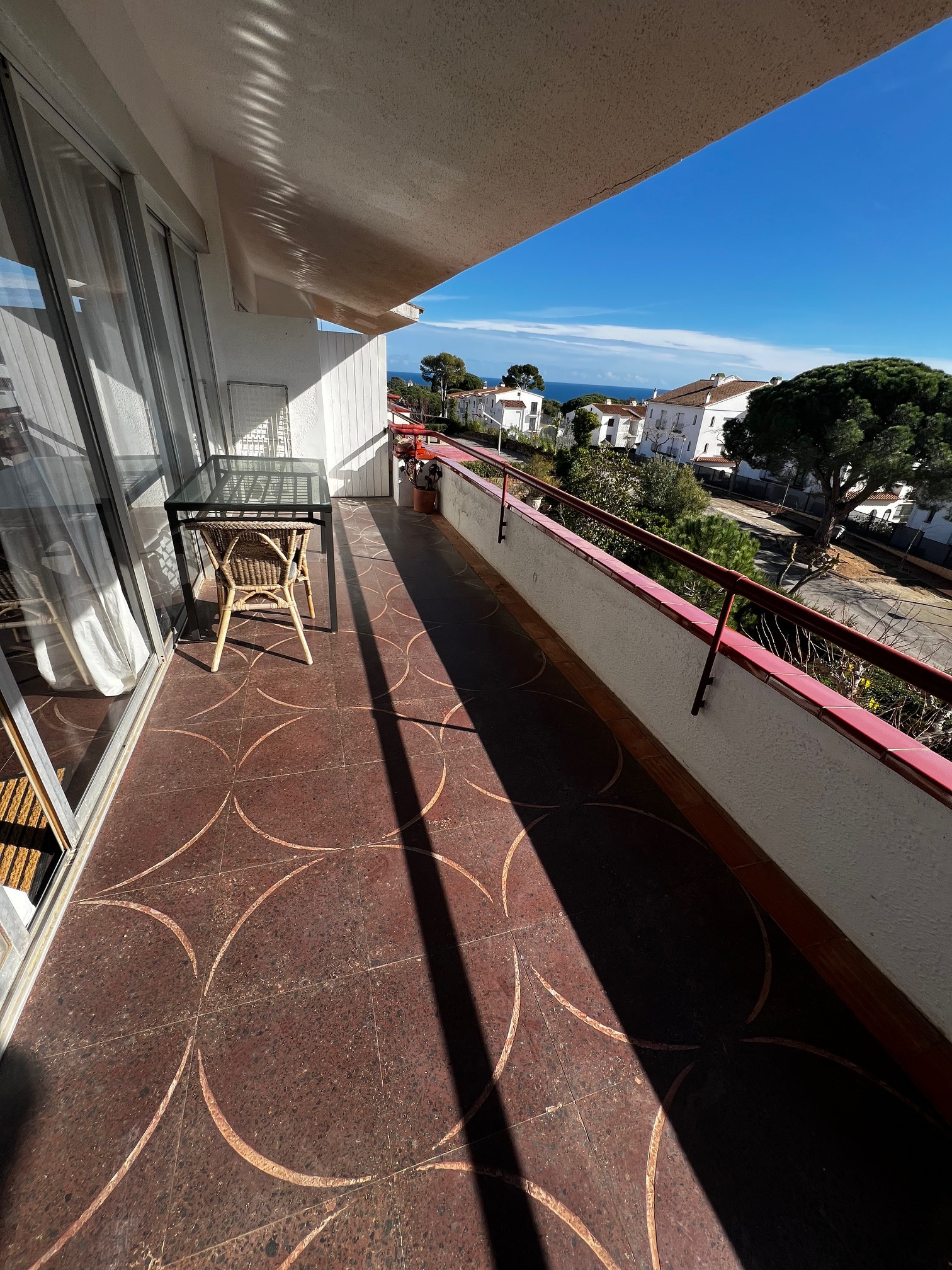 Einfache, große Wohnung in Calella de Palafrugell, 350 m vom Strand und 400 m vom Ortszentrum entfernt. Mit 2 Schlafzimmern (1 Doppelbett; 2 Einzelbetten) und einem offenen Mansardenzimmer mit einem Einzelbett. Küche, Wohn-Esszimmer (Kamin), 2 Bäder, Balkon. In einer Wohnanlage mit Swimmingpool, Gärten, Kinderspielplatz.