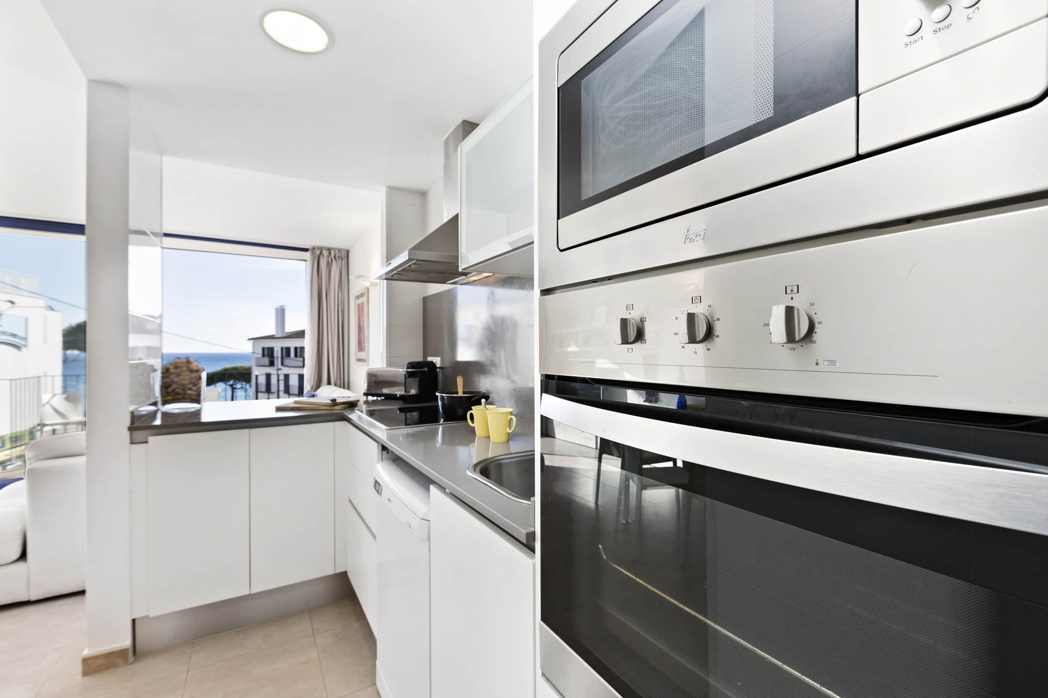 It consists of a modern and fully equipped kitchen (ceramic hob, oven, microwave, dishwasher, washing machine, dryer) open to the living-dining room (TV; small pantry arranged in built-in cupboards). The living room communicates with a small terrace with outdoor furniture and beautiful sea views where you can enjoy breakfasts and meals in the sun. It has 2 double bedrooms (1 double bed (150x190cm) with en-suite bathroom with shower, 2 single beds (90x190cm)) and another bathroom with shower. It has free air conditioning (cold/heat). First floor with lift and intercom. Pets not accepted.