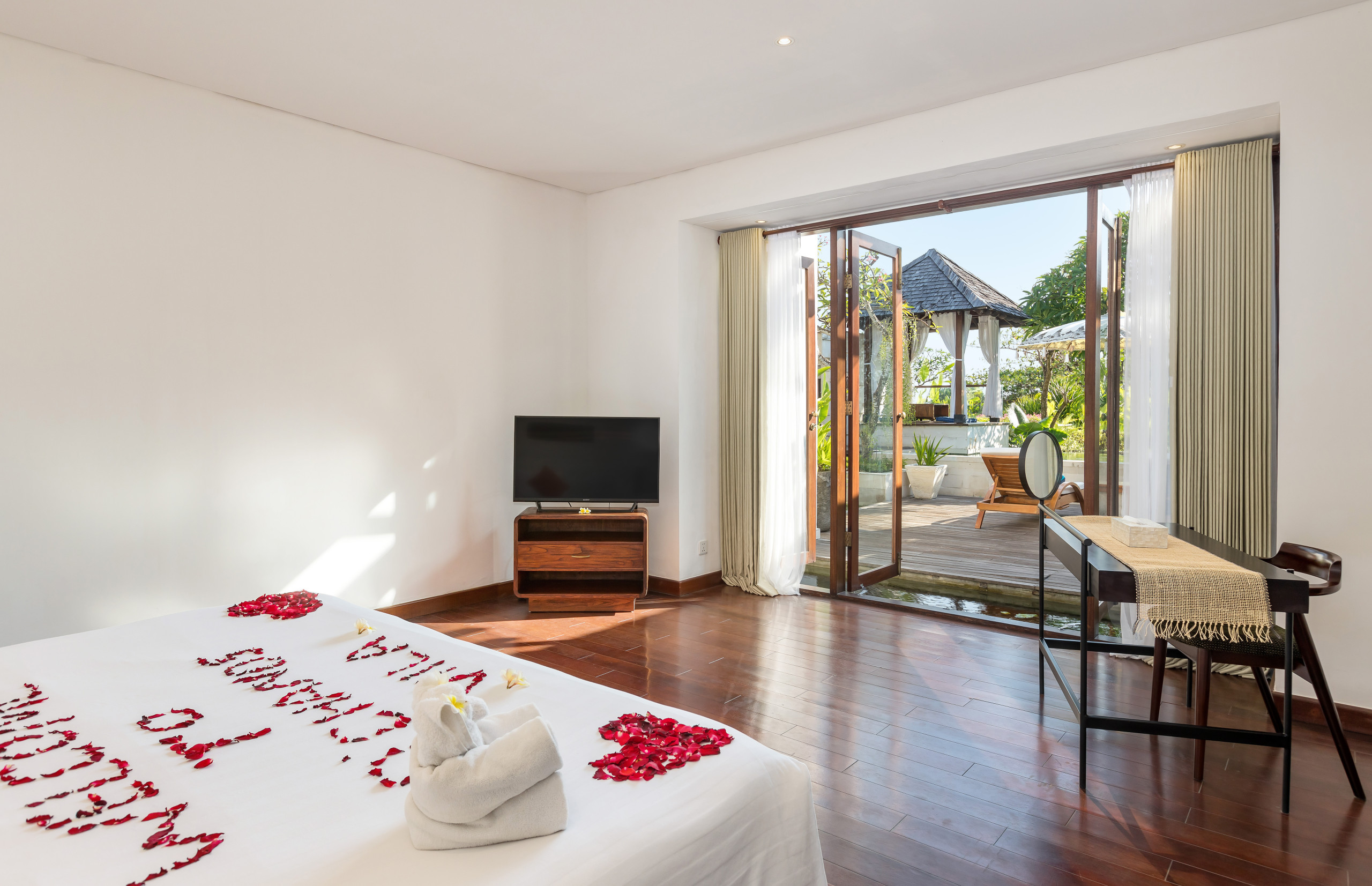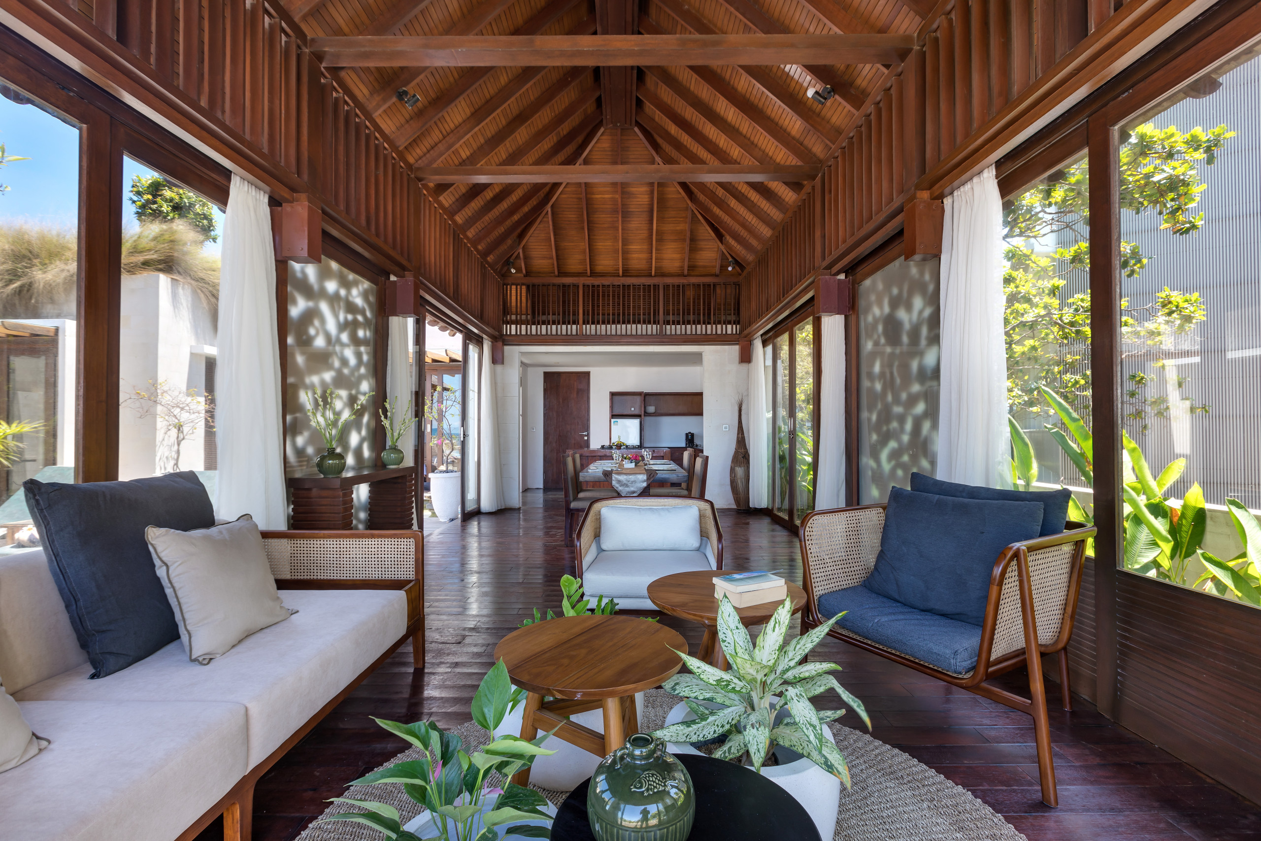 The living areas at The Chand's villas are as inviting as they are unique. The one-bedroom villa boasts an open-air living space with comfortable sofas and unobstructed views of the surroundings, while the two-bedroom villa features a closed living area with glass walls and doors. The second living area offers comfortable seating, a flat-screen TV with DVD player, and is set in a traditional Balinese-style pavilion with wooden interiors. Both villas have dining areas where guests can enjoy family meals prepared in the modern kitchenettes equipped with gas hobs, refrigerators, mini bars, and tea/coffee facilities.