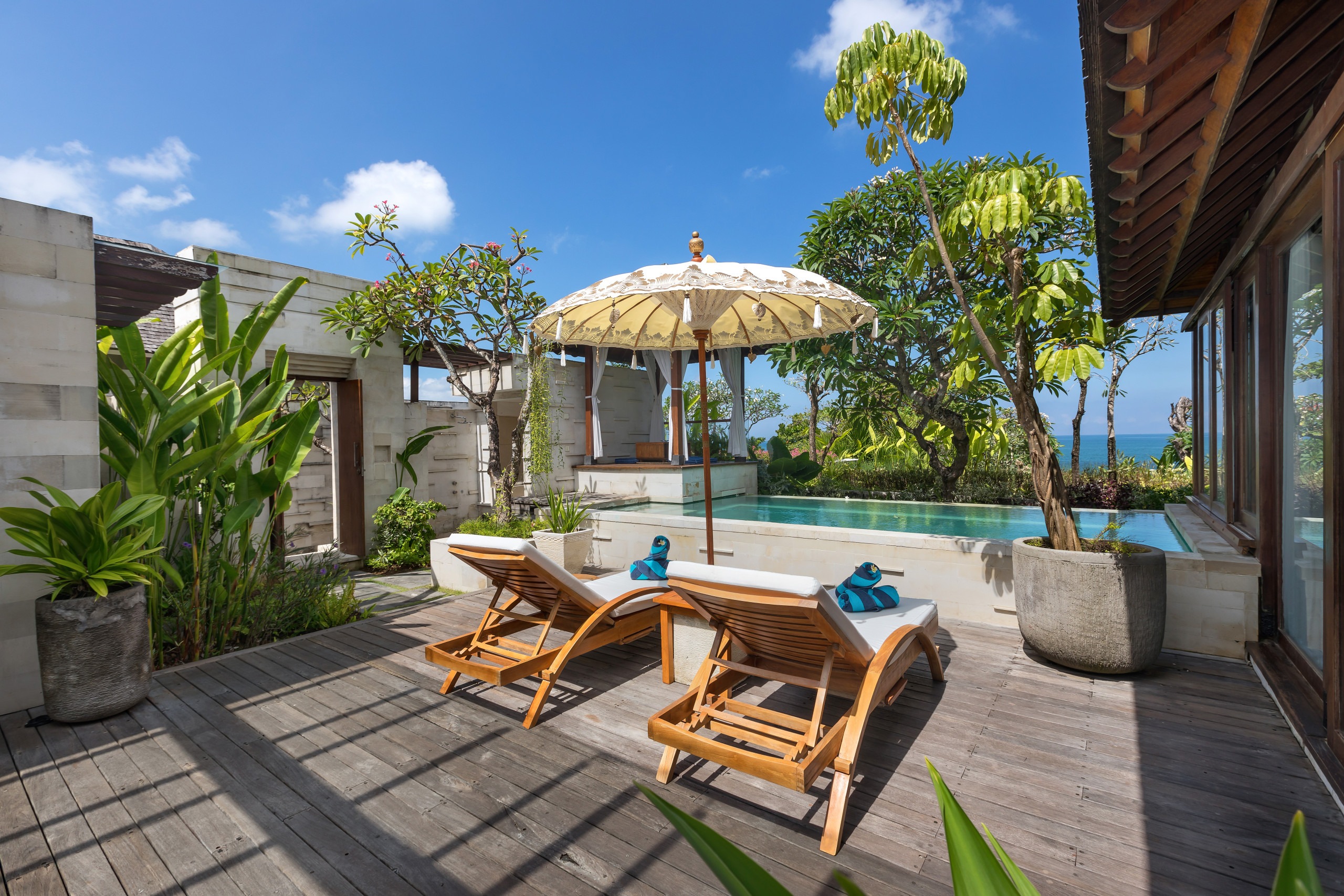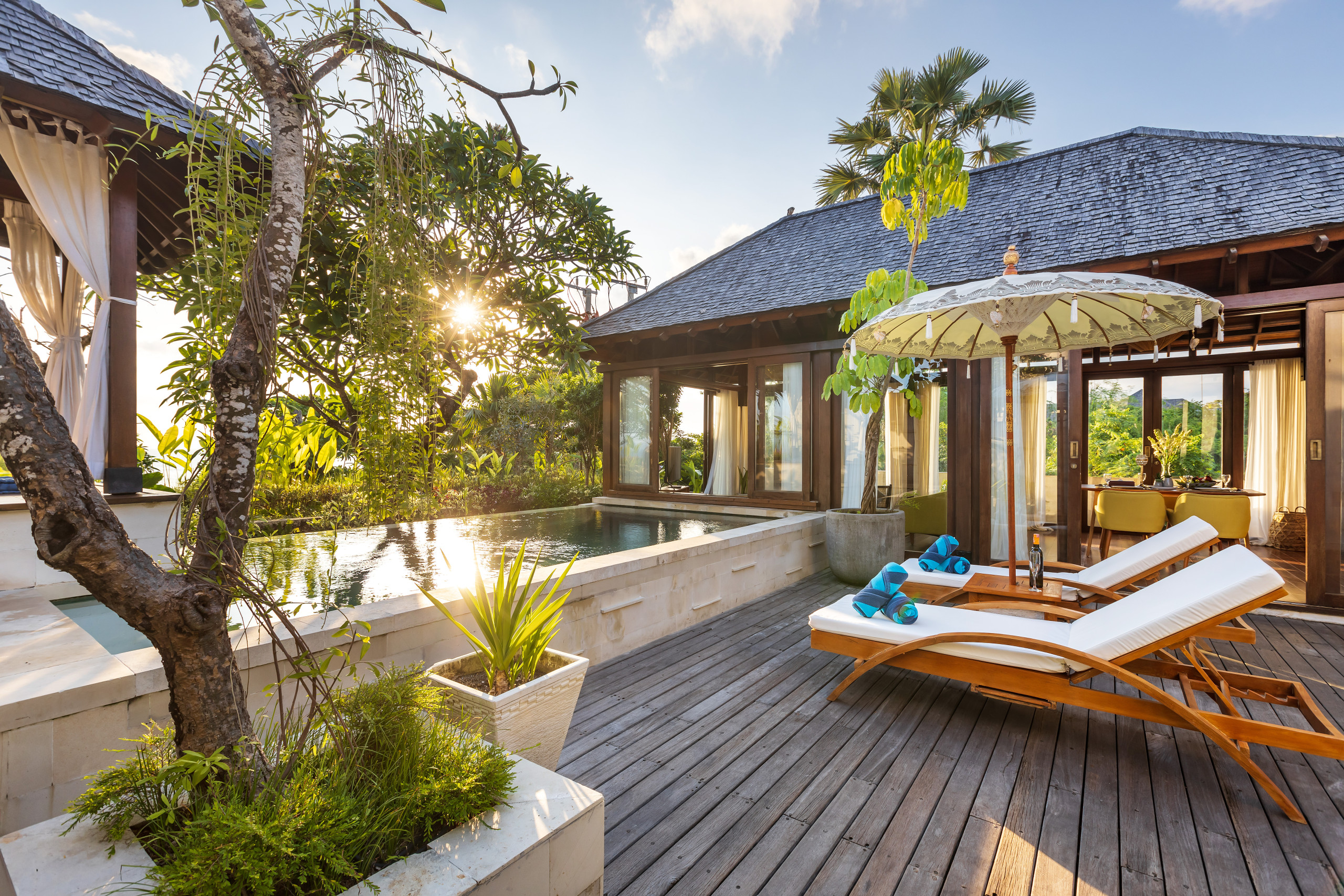 The outdoor areas of both villas are truly enchanting, with infinity swimming pools that offer breathtaking ocean views. Guests can relax on the timber pool deck, sipping on refreshing coconut water or cocktails, surrounded by lush tropical foliage and the picturesque beach. A traditional Balinese gazebo by the pool provides a perfect spot to soak in panoramic vistas. Whether dining al fresco or indoors, guests can enjoy their meals with stunning views all around.