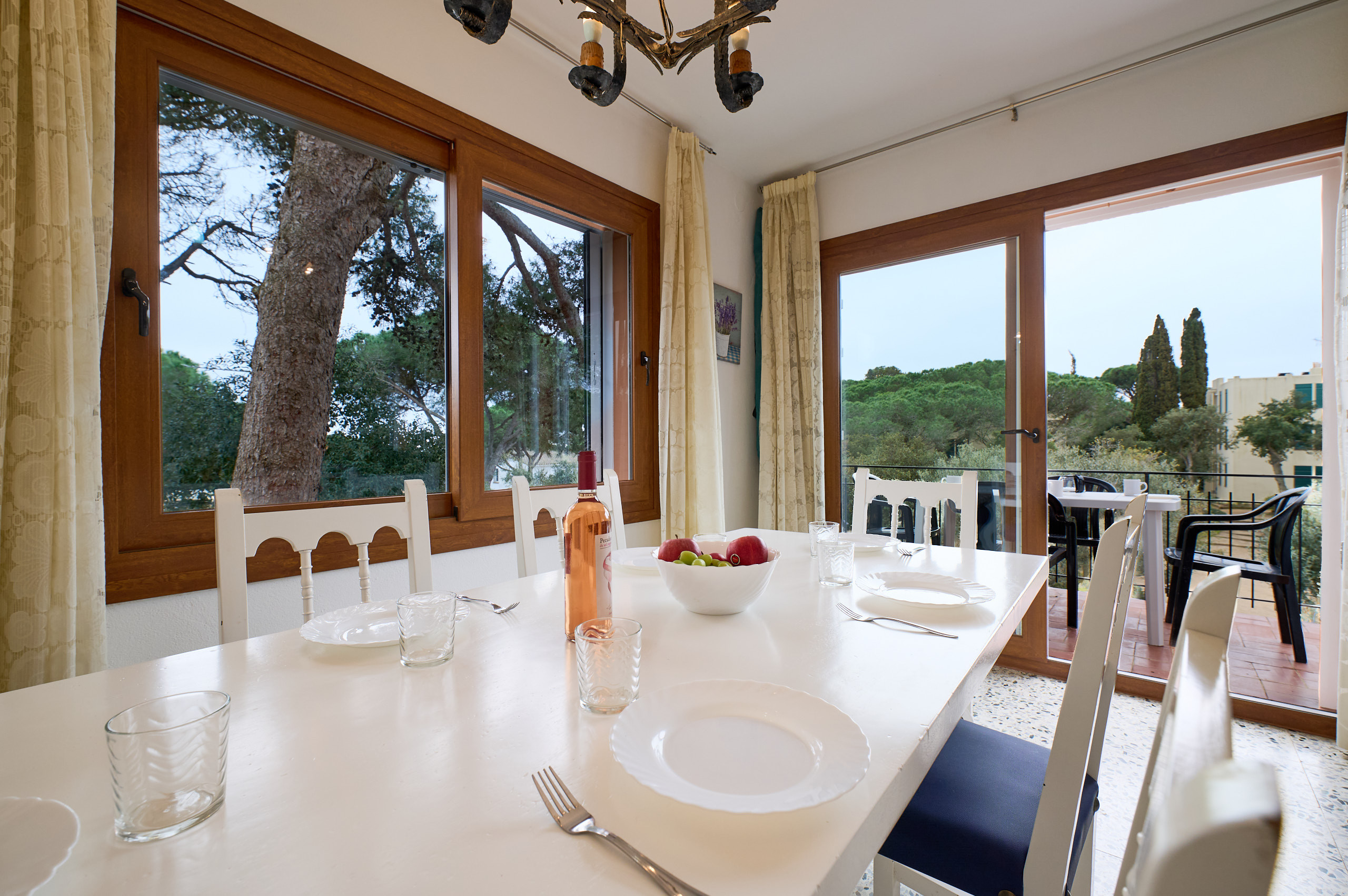 Dispose d'une terrasse où l'on peut profiter des petits-déjeuners et des repas au soleil avec vue sur la piscine, salon-salle à manger avec TV et sortie directe sur la terrasse. Cuisine avec tous les ustensiles pour cuisiner, y compris les couverts, poêles, réfrigérateur, plaque de cuisson à induction, micro-ondes, grille-pain, four, lave-vaisselle et machine à laver. Dispose de 1 chambre avec un lit de mariage (135x190cm), 1 chambre avec 2 lits individuels (90x190cm), 1 chambre avec lits superposés (80x180cm) et 1 salle de bain rénovée avec douche.