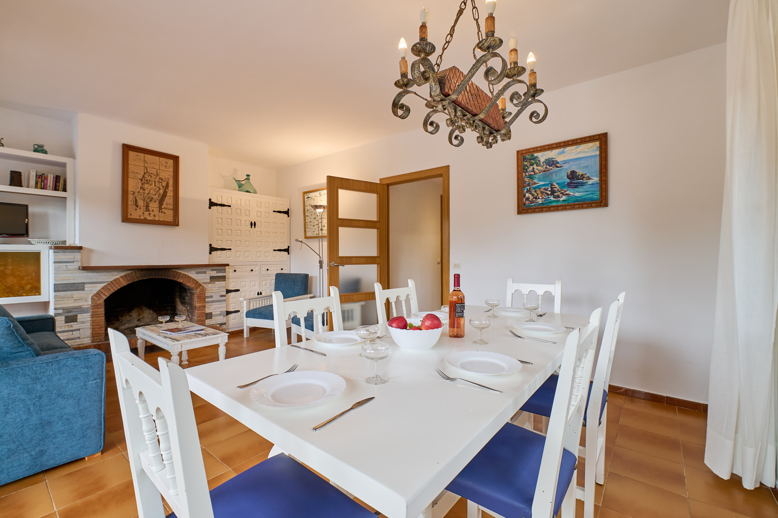Dispose d'un salon avec cheminée, télévision et accès à une terrasse agréable avec une table pour 6 personnes pour profiter des petits-déjeuners ou des repas au soleil.