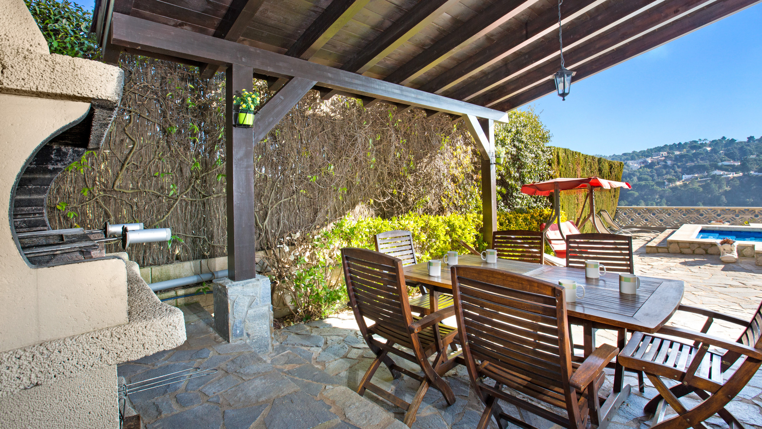 Espace extérieur avec piscine privée et de belles vues sur la montagne, espace barbecue entièrement couvert où vous pourrez prendre le petit déjeuner et les repas en face de la piscine. Il y a aussi un jardin plus bas et la possibilité de garer 1-2 voitures, l'une derrière l'autre.