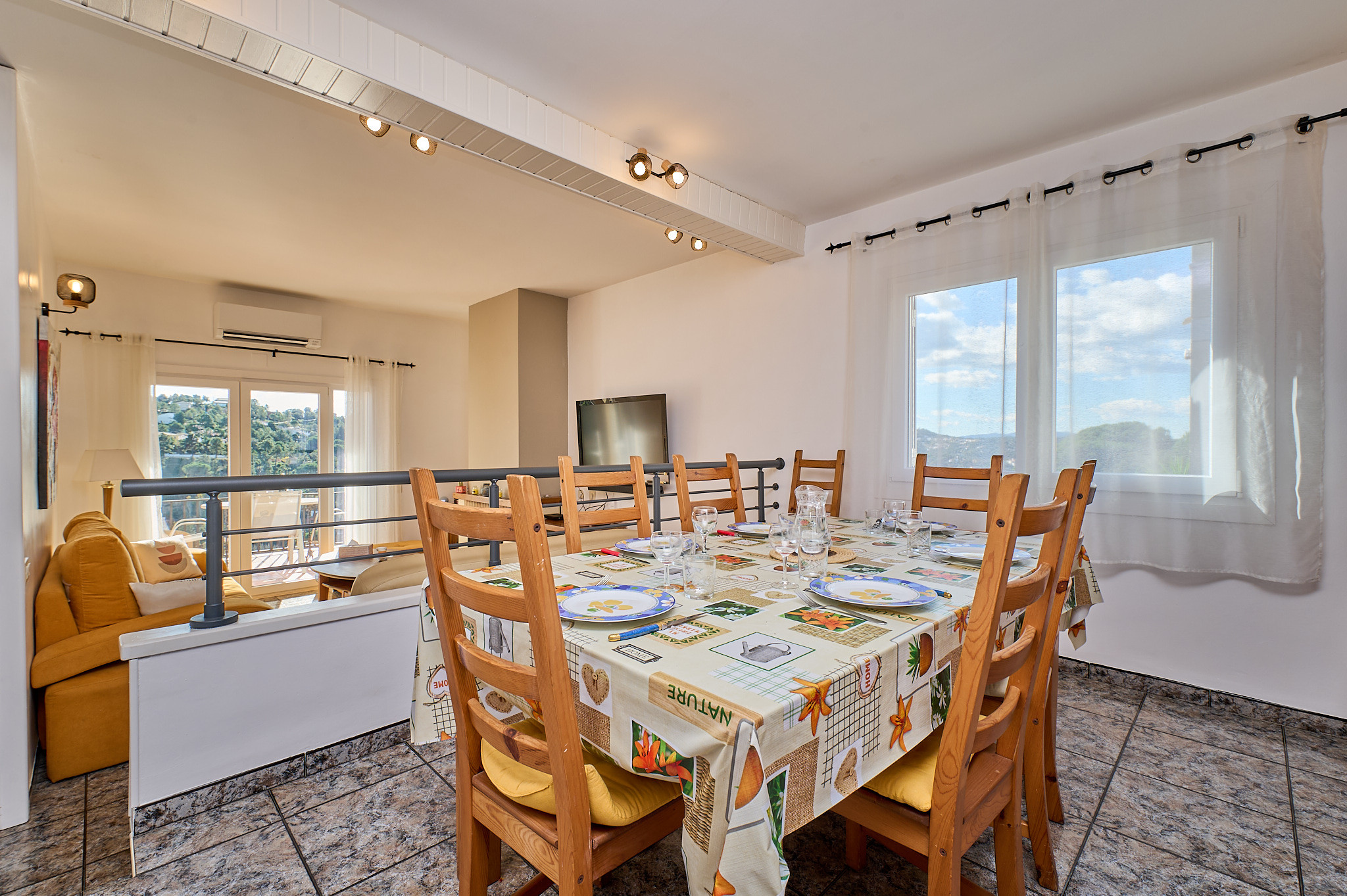 Salle à manger avec tv et accès direct à une terrasse avec belle vue sur la montagne.