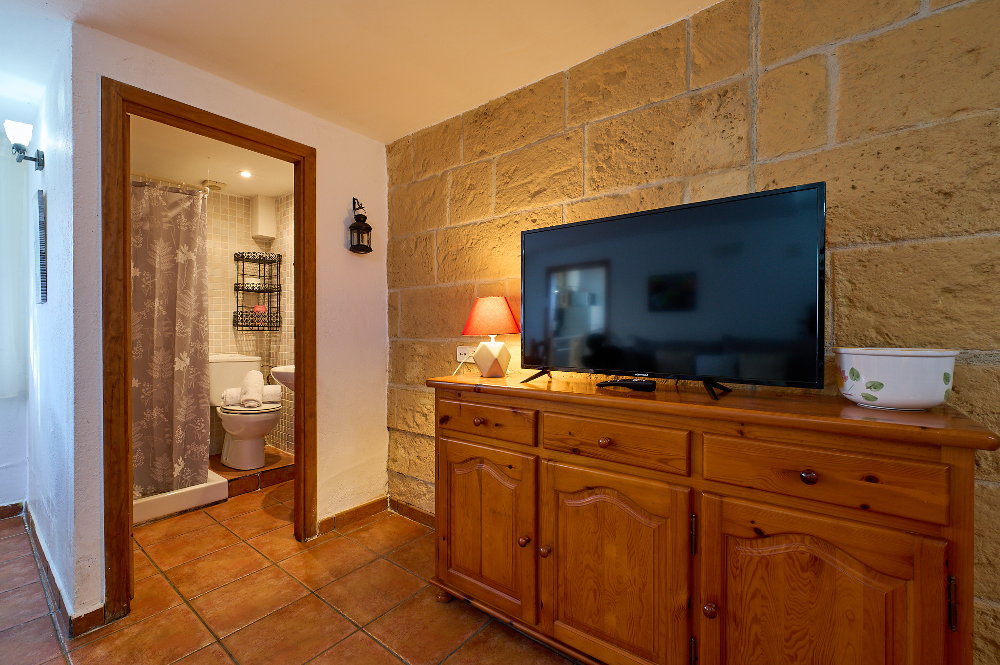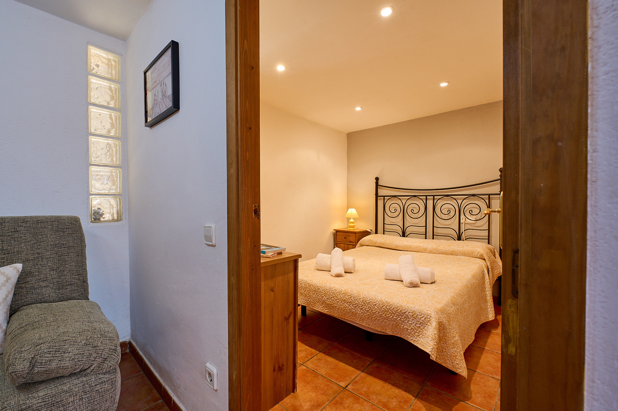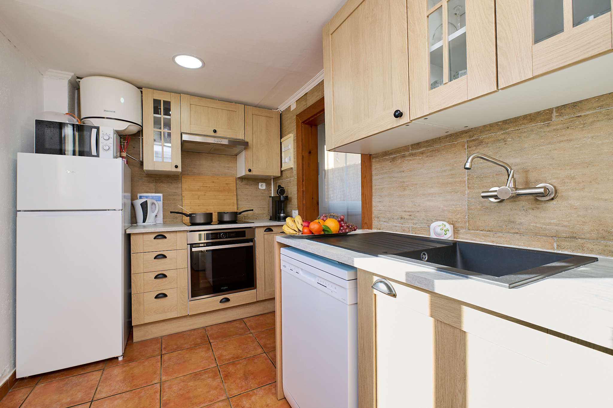130 m2 de surface intérieure répartis sur 2 étages: au rez-de-chaussée se trouve le salon avec TV et cheminée et accès à la terrasse, cuisine équipée (cuisinière à gaz, four, micro-ondes, cafetière), lave-linge, 2 chambres double (lits de 140x190cm), 1 chambre avec deux lits individuels (80 x 180cm et 80 x 190cm), 1 salle de bain avec baignoire et WC. À l'étage inférieur, il y a un appartement complètement indépendant (accès extérieur) avec un salon, une petite cuisine (plaque vitrocéramique, four), un lave-linge, 1 chambre double (lit de 130 x 180cm), 1 salle de bain avec douche.